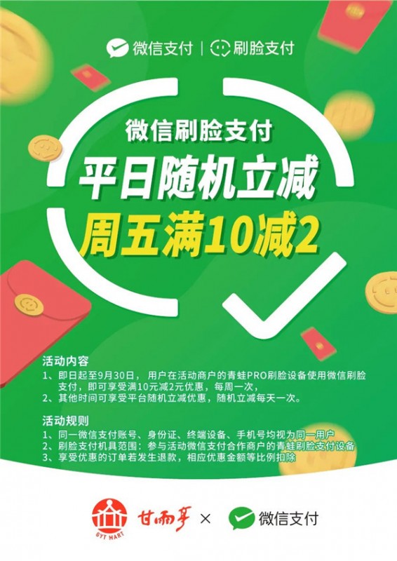 今天小雨給大家?guī)硪粋€(gè)好消息:那就是:即日起至9月30日在甘雨亭使用微信刷臉支付可享受隨機(jī)立減優(yōu)惠 周五滿10減2 周五滿10減2 (注:每人每周可享一次優(yōu)惠,名額有限先到先得。) 平日隨機(jī)立減 ...